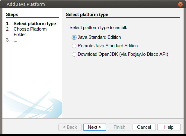 wir einfach eine Platform hinzu: Klick auf "Add Platform...". Wählen dann "Java Standard Edition"