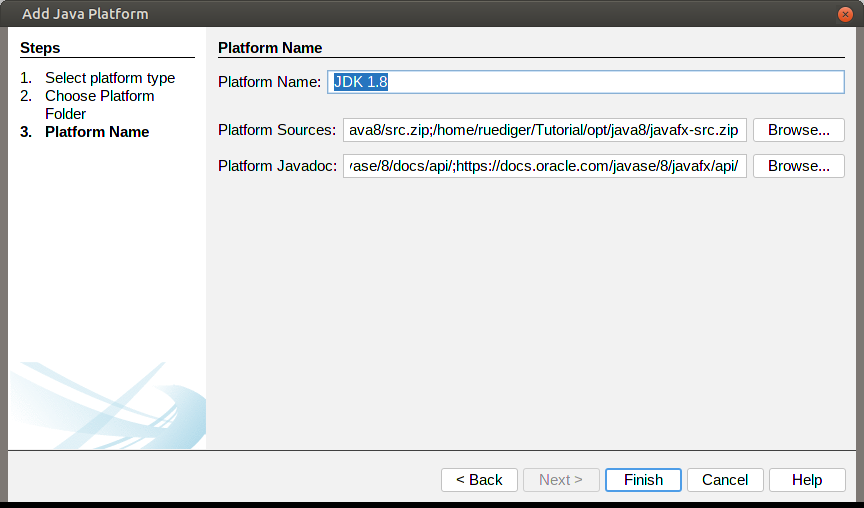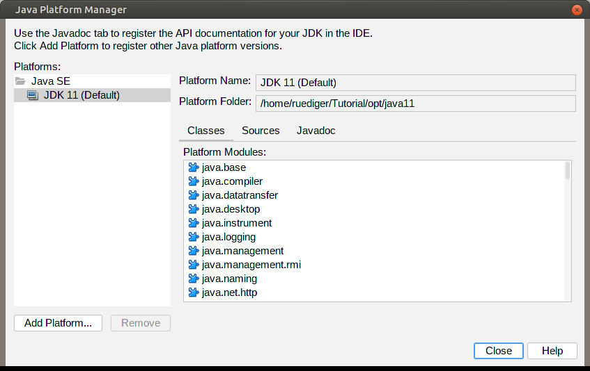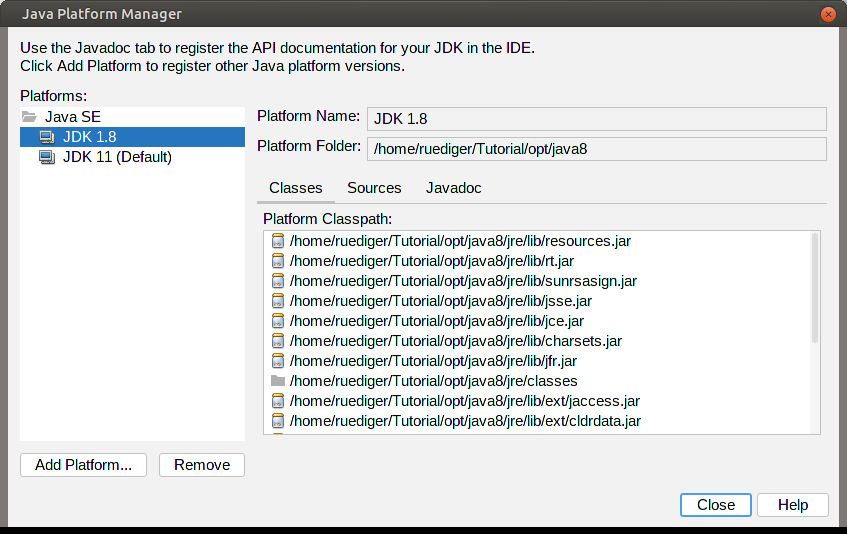 Nach dem Klick auf "Finish" sollten links in der Liste zwei Platformen stehen JDK 1.8 und JDK 11